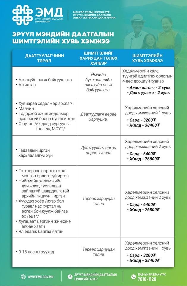 Эрүүл мэндийн даатгалаа хувиараа төлдөг хүмүүс хөдөлмөрийн хөлсний доод хэмжээний 1 хувийг эрүүл мэндийн даатгалд төлдөг. Хөдөлмөрийн хөлсний доод хэмжээг 2019 оны нэгдүгээр сарын 1-нээс 320 мянган төгрөг болгож шинэчлэгдсэнтэй холбоотойгоор эрүүл мэндийн даатгалын хураамж  сарын 3200, жилийн 38400 төгрөг болж өөрчлөгдсөн юм.  Өнгөрсөн жил хөдөлмөрийн хөлсний доод хэмжээ 240 мянган төгрөг, эрүүл мэндийн даатгалын жилийн хураамж 28800 төгрөг байсан байна.