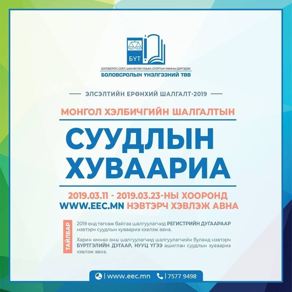 2019 онд төгсөж байгаа шалгуулагчид https://eyesh.eec.mn/home/mhb хуудаст регистрийн дугаараар нэвтэрч суудлын хуваариа хэвлэж авна.