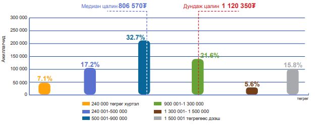 Нэг ажилтанд ногдох сарын дундаж цалин 2018 оны 4 дүгээр улирлын байдлаар 1.1 сая төгрөг болж, өмнөх оны мөн үеэс 81.4 (7.8%) мянган төгрөгөөр, өмнөх улирлаас 88.5 (8.6%) мянган төгрөгөөр нэмэгджээ.