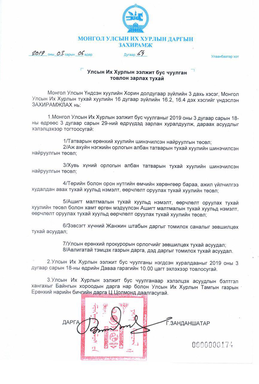 Монгол Улсын Их Хурлын дарга Г.Занданшатар 2019 оны 03 дугаар сарын 06-ны өдөр захирамж гаргаж, Улсын Их Хурлын ээлжит бус чуулганыг 2019 оны 03 дугаар сарын 18-ны өдрөөс 03 дугаар сарын 29-ний өдрүүдэд зарлан хуралдуулахаар товлон зарласан.