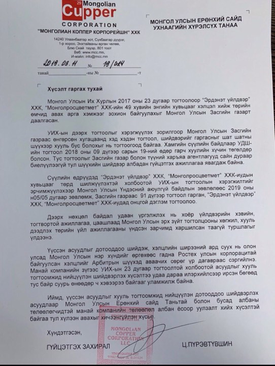 “Монголиан коппер корпорейшн” ХХК-иас Засгийн газарт өчигдөр /2019.03.12/ хүсэлт хүргүүлжээ. “Эрдэнэт үйлдвэр”-ийн 49 хувийн асуудлыг хууль тогтоомжид нийцүүлэн дотооддоо шийдвэрлэж, хэлцлийн ширээний ард суух хүсэлтээ уламжилсан юм.