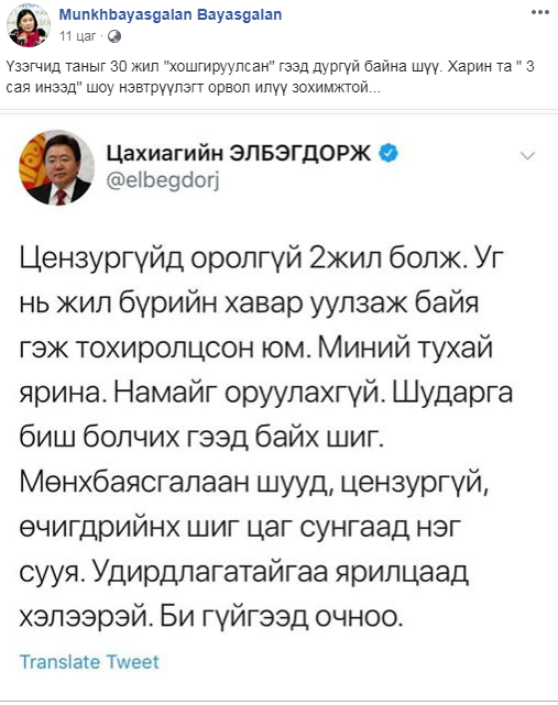 Ерөнхийлөгч асан Ц.Элбэгдорж “Цензургүй яриа” нэвтрүүлэгт оролцох хүсэлтээ өчигдөр өөрийн цахим хуудсаараа дамжуулж С.Мөнхбаясгаланд хүргүүлсэн. Учир нь Ерөнхий сайд асан Н.Алтанхуягийн зөвлөх Л.Гансүх экс Ерөнхийлөгчийн явуулгаар шударга бусын хонгилд орж, хэлмэгдсэн гэдгээ ярьсан юм. Иймээс Ерөнхийлөгч Ц.Элбэгдорж энэ нэвтрүүлэгт орж хариу тайлбар өгөхийг хүссэн.
