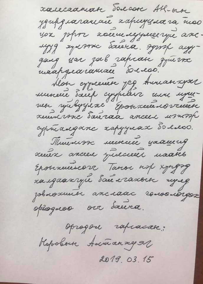 Монгол Улсын Ерөнхийлөгч Х.Баттулгын улс төрийн бодлогын зөвлөх Н.Алтанхуяг зөвлөхийн ажлаасаа чөлөөлөгдөх өргөдлөө өнөөдөр /2019.03.15/ өглөө.