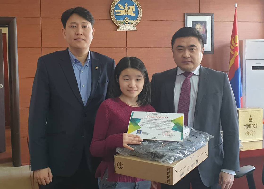 “Тусгаар тогтнол” Улсын математикийн зургадугаар олимпиадад “Уран бодолт” төрөлд ялалт байгуулсан Б.Долгормаад БСШУС-ын дэд сайд Г.Ганбаяр шагнал гардуулж, амжилт хүслээ.