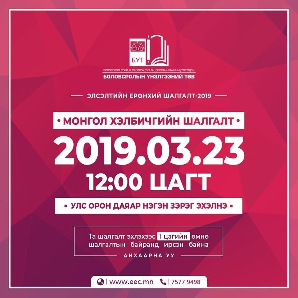 ЕЭШ-ын Монгол хэл бичгийн шалгалт 2019 оны гуравдугаар сарын 23-ны Бямба гарагт 12:00 цагаас улс орон даяар нэгэн зэрэг эхэлнэ.