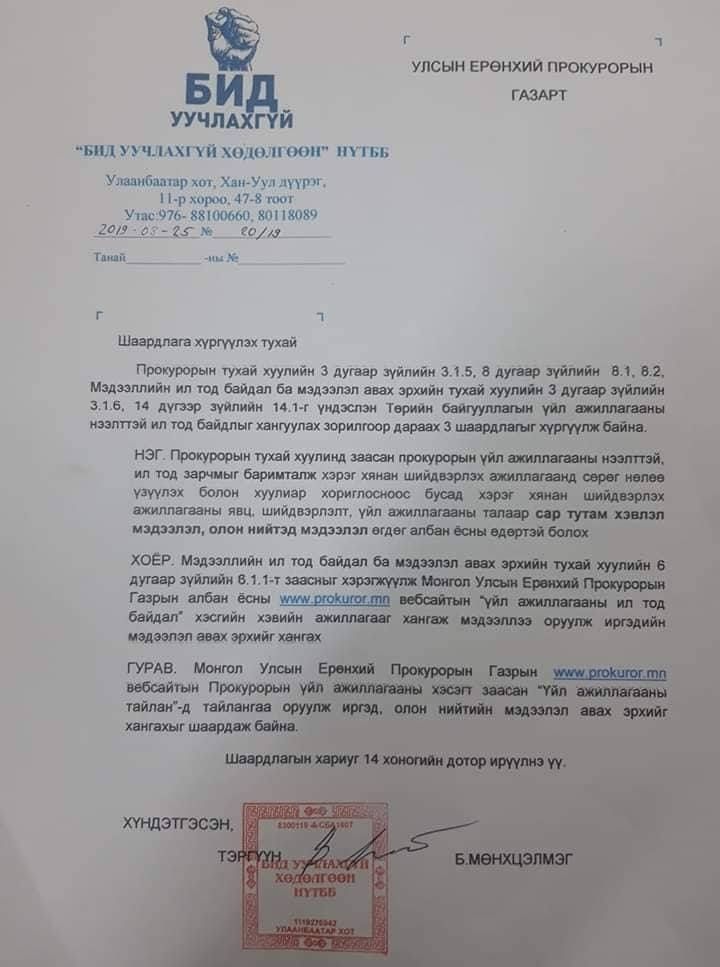 Иймд прокурорын тухай хуулийн 3.1.5, 8.1, 8.2-г үндэслэн сар тутмын нэг өдөр олон нийтэд мэдээлэл хийдэг тогтмол цагтай болох, мөн Мэдээллийн ил тод байдал ба мэдээлэл авах эрхийн тухай хуулийн 3.1.5, 6.1.1, 14.1-т заасан үүргээ хэрэгжүүлж иргэд, хэвлэл мэдээллийн байгууллагуудын мэдээлэл авах эрхийг хангаж өөрсдийн байгууллагын албан ёсны www.prokuror.mn сайтад үйл ажиллагааны тайлангаа оруулахыг шаардаж байна” гэлээ.