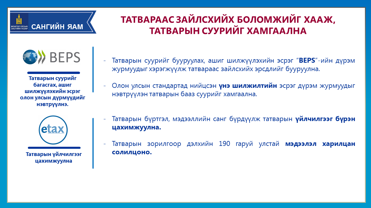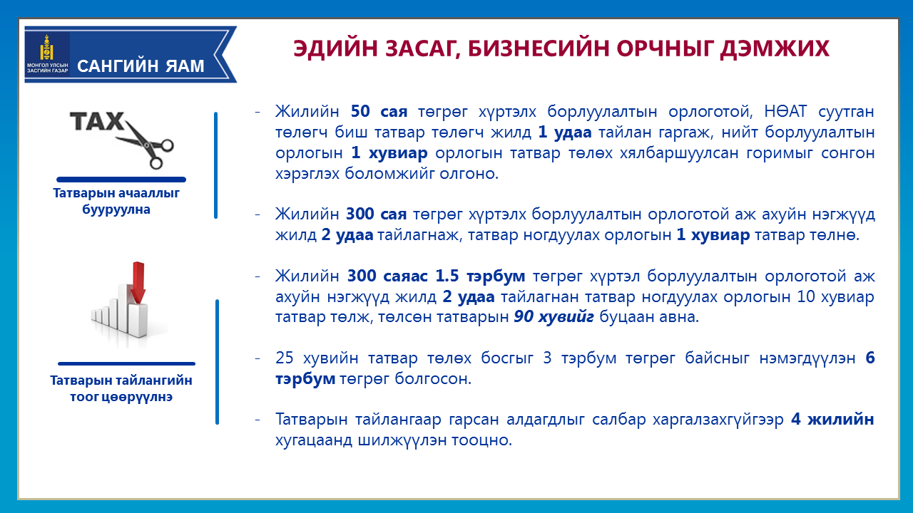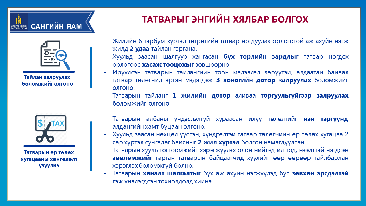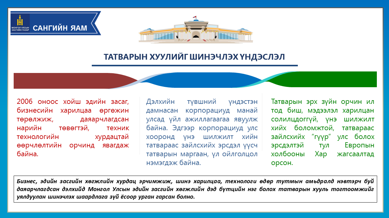 УИХ-ын ээлжит бус чуулганаар /2019.03.22/ Татварын ерөнхий хуулийн шинэчилсэн найруулгын төсөл болон хамт өргөн мэдүүлсэн хуулийн төслүүд, Татварын ерөнхий хуульд нэмэлт, өөрчлөлт оруулах тухай хуулийн нэгтгэсэн төслүүдийг батлаад байгаа билээ. Татварын багц хууль шинэчлэгдсэн заалтуудыг танилцуулъя.