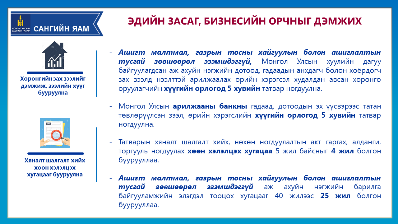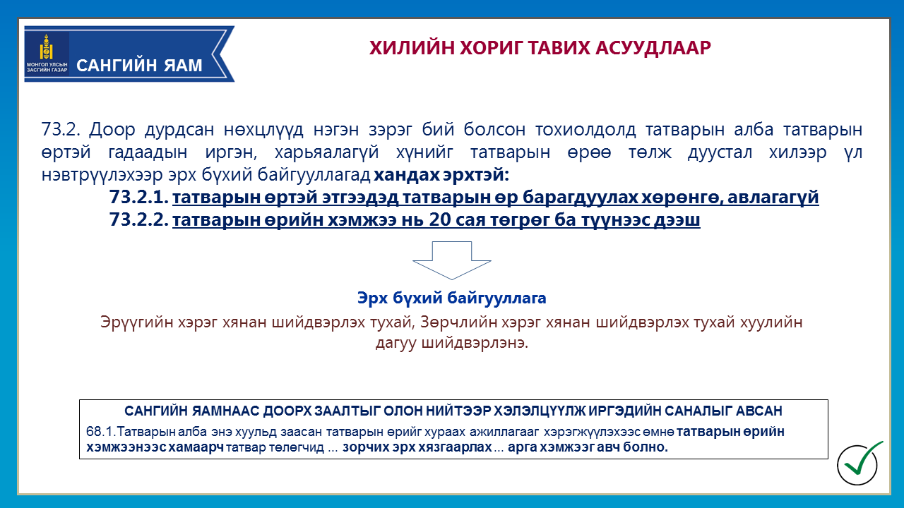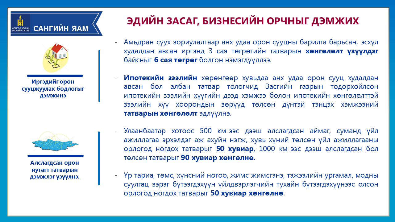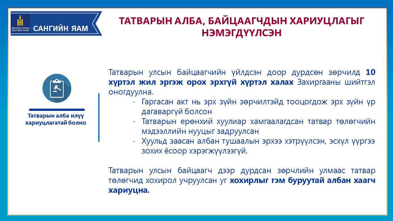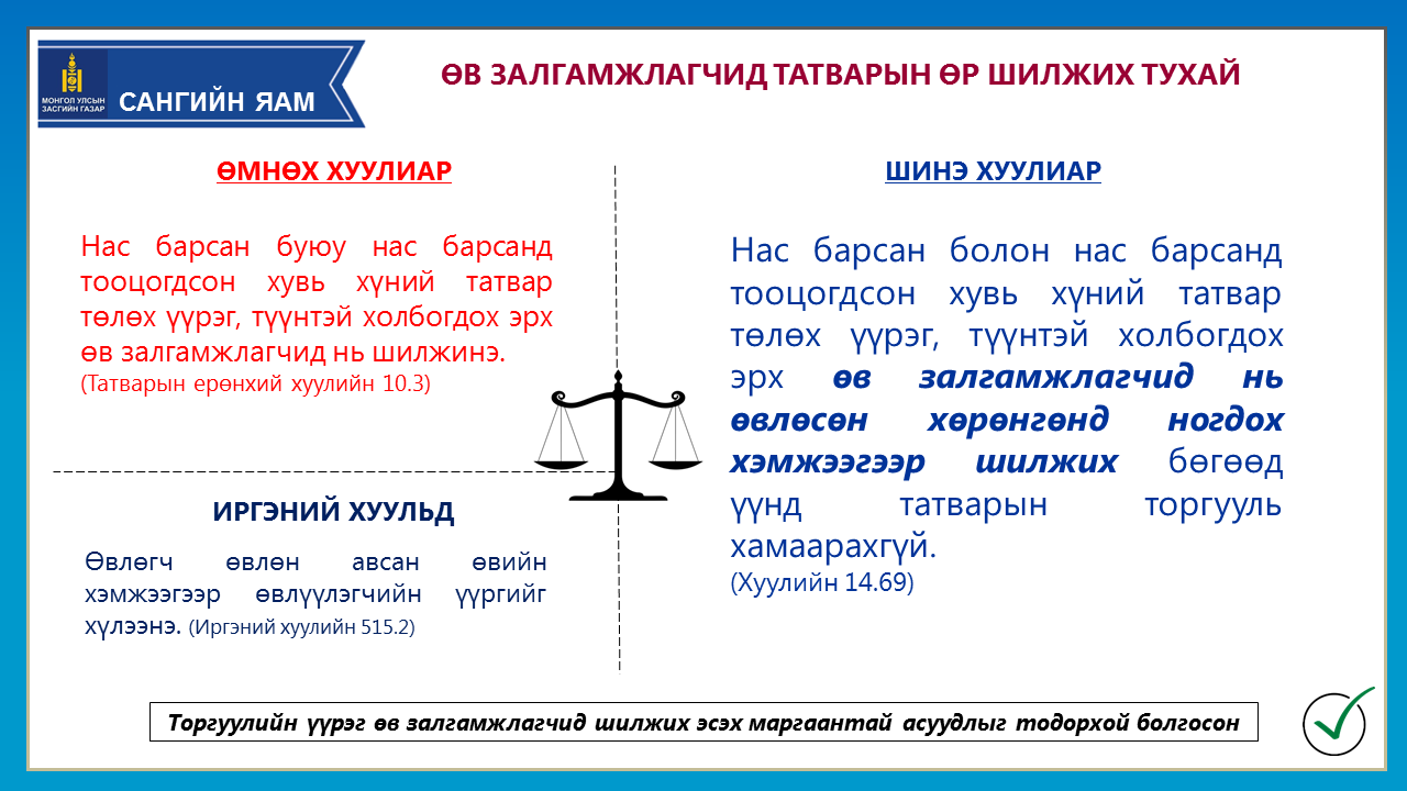 УИХ-ын ээлжит бус чуулганаар /2019.03.22/ Татварын ерөнхий хуулийн шинэчилсэн найруулгын төсөл болон хамт өргөн мэдүүлсэн хуулийн төслүүд, Татварын ерөнхий хуульд нэмэлт, өөрчлөлт оруулах тухай хуулийн нэгтгэсэн төслүүдийг батлаад байгаа билээ. Татварын багц хууль шинэчлэгдсэн заалтуудыг танилцуулъя.