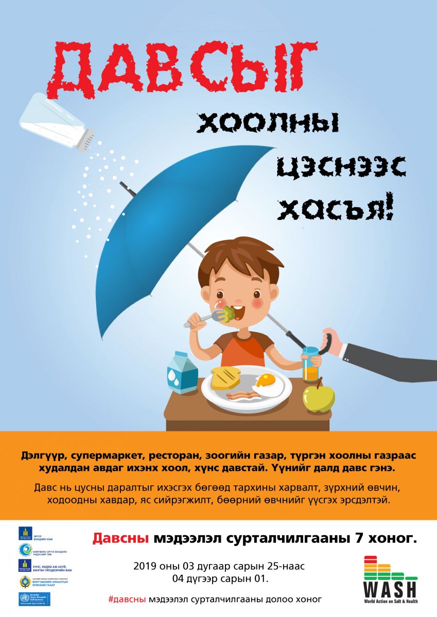 “Давс ба эрүүл мэнд” Дэлхийн хөдөлгөөний санаачлагаар улс орнууд “Давсны мэдээлэл сурталчилгааны долоо хоног”-ийг жил бүр гуравдугаар сард тэмдэглэн өнгөрүүлдэг уламжлал тогтсон билээ. Энэ жил хоолны давс, ялангуяа хүүхдэд өгч буй хоол хүнсний давсыг багасгах, улмаар давсыг хоолны цэснээс хасах асуудалд дэлхий нийтийн анхаарлыг хандуулж байна. Уг хөдөлгөөнд Монгол Улс 2012 онд нэгдэн орсон бөгөөд энэ жил “Давсыг хоолны цэснээс хасъя” гэсэн уриан дор ЭМЯ, НЭМҮТ, ХХААХҮЯ, БСУШСЯ, МХЕГ хамтран 2019 оны гуравдугаар сарын 25-ны өдрөөс дөрөвдүгээр сарын 01-ны хооронд тэмдэглэн өнгөрүүлж байна.