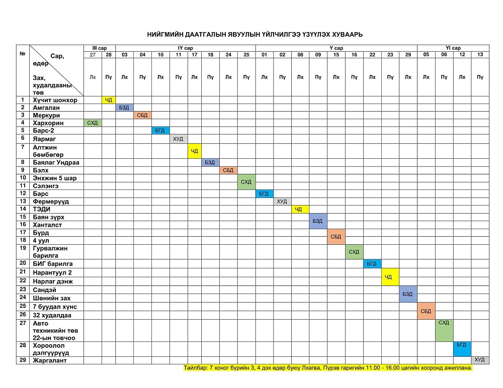 Нийгмийн даатгалын “явуулын үйлчилгээ” нь малчны хот, худалдаачны лангуу, ажилтны ажлын байранд хүрч үйлчлэх бөгөөд нийслэлд 7 хоногт 2 удаа, аймагт сар бүр нэг удаа зохион байгуулагдах аж.