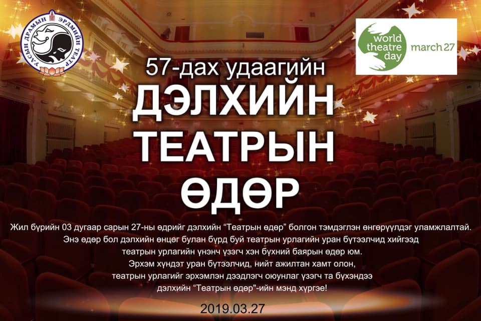 1962 оноос эхлэн жил бүрийн 3 сарын 27-ны өдрийг дэлхийн “Театрын өдөр” болгон тэмдэглэн өнгөрүүлдэг уламжлалтай. Энэ өдөр бол дэлхийн өнцөг булан бүрд буй театрын урлагийн уран бүтээлчид хийгээд театрын урлагийн үнэнч үзэгч хэн бүхний баярын өдөр юм.