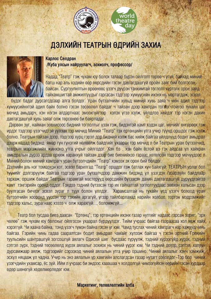 Улсын Драмын Эрдмийн театрын уран бүтээлчид энэхүү баярыг угтаж жил бүрийн гуравдугаар сарыг “Сонгодог жүжгийн өдрүүд” болгон зарлаж өөрийн урын сан дахь дэлхийн сонгодог бүтээлүүдээс сор болсон жүжгүүдээ үзэгч түмэндээ өргөн барьдаг билээ.