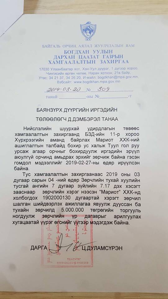 Туул гол руу бохир нь цутгаж, агаар болон орчныг бохирдуулсан гэх асуудалд холбогдох байгууллагуудаас 5 сая төгрөгийн торгууль тавьж, зөрчлөө арилгахыг үүрэгджээ. 3-4 тэрбум төгрөгөөр зарагдсан уг хотхонд 53 айл амьдардаг аж.