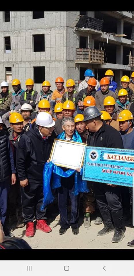 Үүний дараа тус сургуулийн ойролцоо баригдаж байгаа “Ханбогд ресиденс” хороололд очиж, барилгачидтай уулзлаа. Энэ үеэр Дэлхийн гурван удаагийн аварга Ц.Раднаа гуайн амжилтыг үнэлж Кёкүшюүзан Д.Батбаяр, улсын заан Ч.Батзориг нар Ханбогд резиденс хорооллын хоёр өрөө байрны батламж гардуулсан юм.