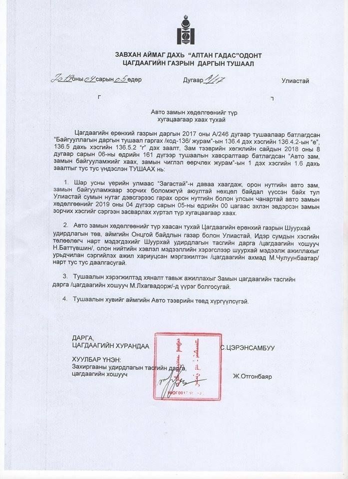 Тодруулбал, шар усны үерийн улмаас Загастайн даваа хаагдаж, авто замын байгууламжаар зорчих боломжгүй, аюултай нөхцөл байдал үүссэн тул Улиастай сумын нутаг дэвсгэрээс гарах буюу уг даваагаар зорчих орон нутгийн болон улсын чанартай авто замын хөдөлгөөнийг 2019 оны дөрөвдүгээр сарын 05-ны 00:00 цагаас эхлэн хаажээ.