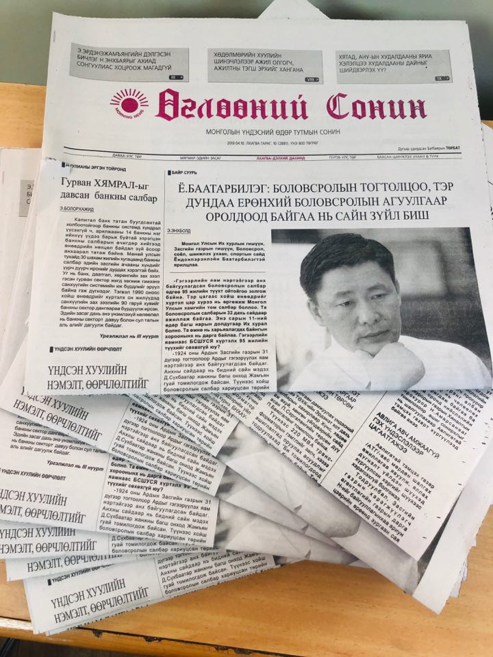 “Өглөөний сонин”-ы лхагва гаригийн шинэхэн дугаар уншигч таны гар дээр очиж байна. Манай сонины өнөөдрийн дугаарт “Капитал” банк болон банкны салбарт гарч буй хямралын тухай баримт түшсэн нийтлэл, БСШУС-ын сайд Ё.Баатарбилэгийн боловсролын салбарт өрнүүлж буй ажлын тухай дэлгэрэнгүй ярилцлага, олны анхаарлын төвд ороод буй “Эрдэнэт” үйлдвэрийн трансформатор хэрхэн доголдсон тухай байр суурь, энэ онд хэрэгжүүлэх уул уурхайн том төслүүдээс юу хүлээж болох гээд олон сонирхолтой нийтлэл, материалууд нийтлэгдлээ.