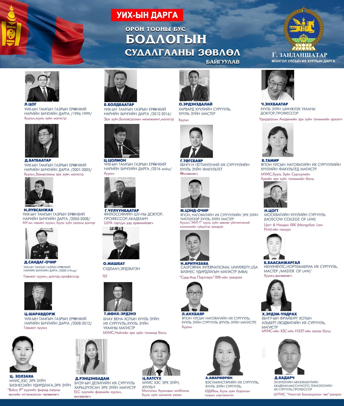 Үе үеийн УИХ-ын Тамгын газрын Ерөнхий нарийн бичгийн дарга нар, ШУА, МУИС, Удирдлагын академи, АНУ, Их Британи, ОХУ, Япон, Франц, Герман зэрэг улсад хуулийн чиглэлээр доктор, магистрын зэрэг хамгаалсан, олон улсын туршлага судалсан гурван үеийн эрдэмтэн, судлаач, профессоруудын төлөөллийг Бодлогын зөвлөлд хамруулсан байна.