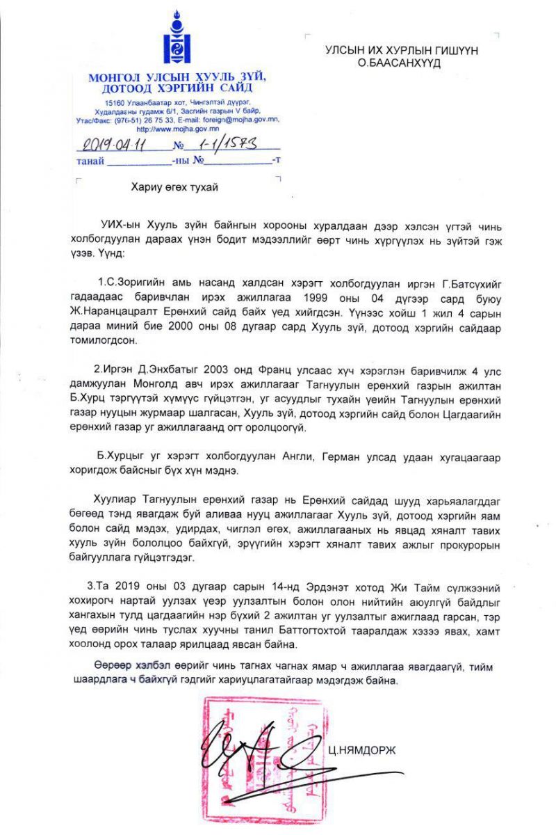 Тэрбээр уг хариу бичигтээ, УИХ-ын Хууль зүйн байнгын хорооны хуралдаан дээр хэлсэн үгтэй тань холбогдуулан дараах үнэн бодит мэдээллийг хүргүүлэх нь зүйтэй гэж үзэж байна.