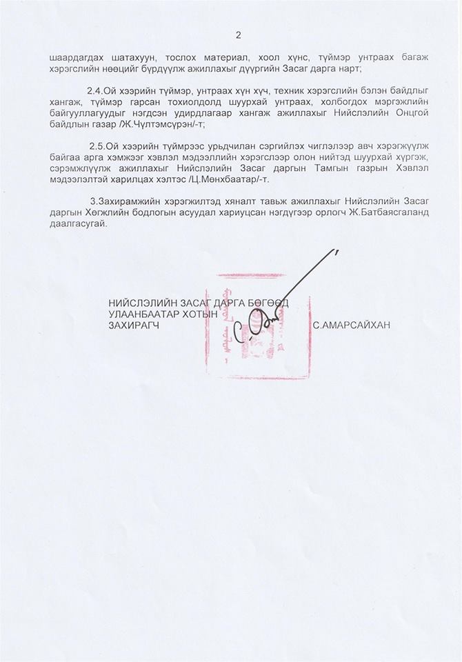 Захирамжийн хэрэгжилтийг хангаж ажиллахыг холбогдох агентлаг, дүүргийн Засаг дарга нарт үүрэг болголоо.