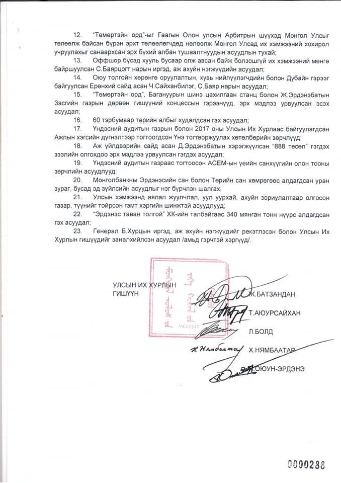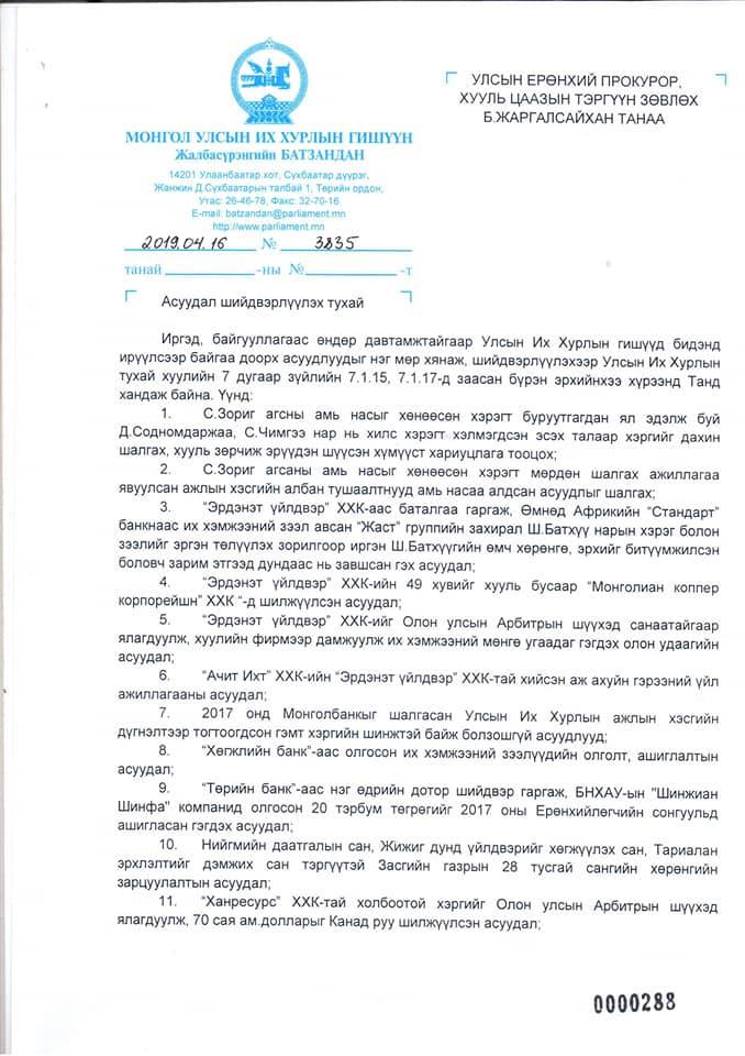 УИХ-ын гишүүн Ж.Батзандан, Л.Оюун-Эрдэнэ, Х.Нямбаатар, Л.Болд, Т.Аюурсайхан нар Монгол Улсын Ерөнхий прокурор, хууль цаазын тэргүүн зөвлөх Б.Жаргалсайханд хандан албан тоот илгээжээ.