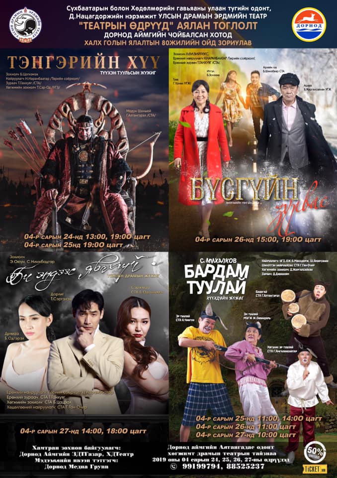 Мэргэжлийн урлагийн ууган байгууллага Улсын Драмын Эрдмийн Театрын хамт олон 2019 оны “Театрын өдрүүд” хаврын аялан тоглолтоо Халх голын дайны ялалтын 80 жилийн ойд зориулан 4 сарын 24-ны өдрөөс Дорнод аймгаас эхлэн тоглохоор бэлтгэл ажлаа хангаад байна.
