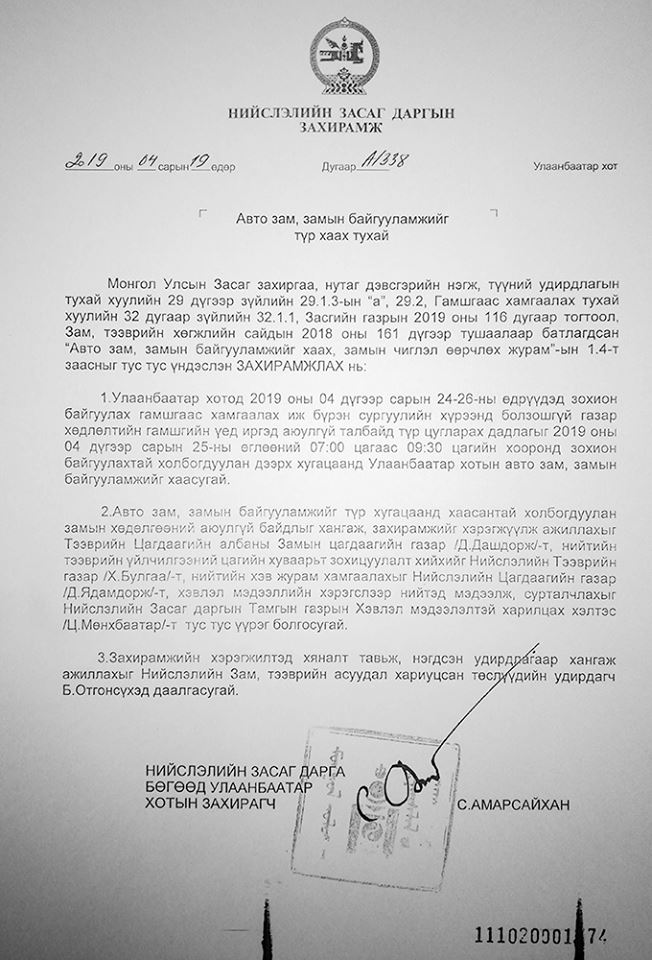Нийслэлийн Засаг даргын захирамжтай холбоотойгоор хотын замын хөдөлгөөний аюулгүй байдлыг хангаж, ард иргэдийг дадлага сургуулилалтаа тайван хийх боломж нөхцөлөөр хангахыг холбогдох байгууллагуудад үүрэг болголоо гэж нийслэлийн ЗДТГ-ын Хэвлэл мэдээлэлтэй харилцах хэлтсээс мэдээлэв.