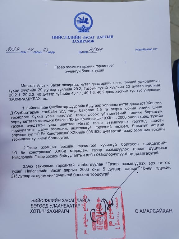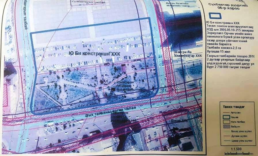 Нийслэлийн Засаг дарга бөгөөд Улаанбаатар хотын Захирагч С.Амарсайхан өнөөдөр /2019.04.23/ 2006 онд Ю Би констракшн компанид олгосон Сүхбаатарын талбайн урд хэсгийн 2.5 га талбайг эзэмших эрхийн гэрчилгээг хүчингүй болгох захирамж гаргалаа. Хотын дарга дөнгөж сая газар эзэмших эрхийн гэрчилгээг хүчингүй болгосон захирамжаа танилцууллаа.