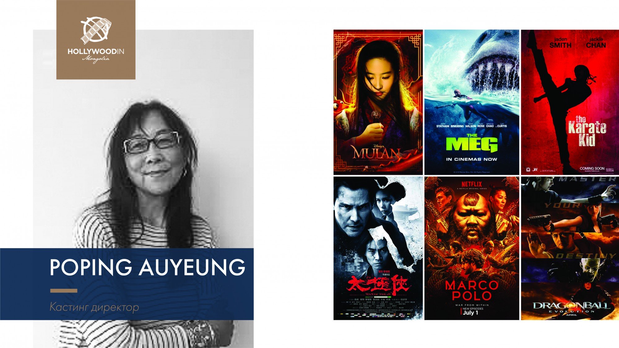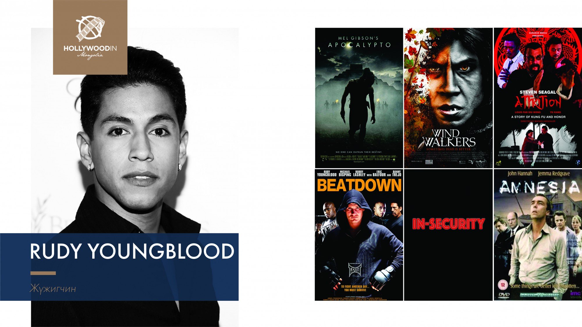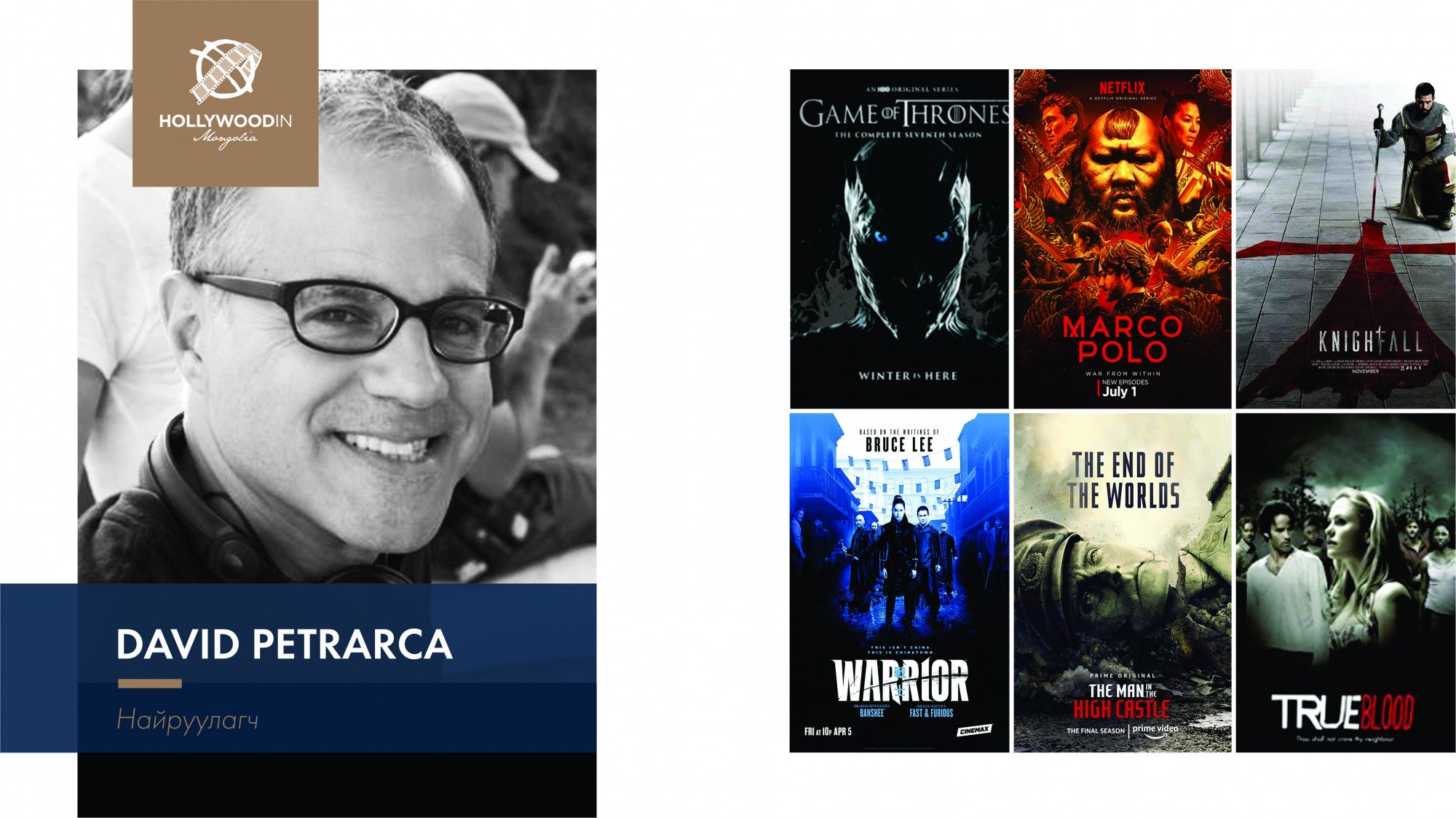 “Холливуд Монголд” наадмын үеэр Холливүүдийн алдартай жүжигчдийн дасгалжуулагч Ивана Чаббак, “Apocalypto” киногоороо алдартай жүжигчин Руди Янгблад, “Game of Thrones”, “Marco Polo”, “Warrior” киноны найруулагч Дэвид Петрарка, “Мулан”, “Галзуу баян азиуд” “Нарниа” киноны продюсер Тим Коддингтон, “The Meg” киноны жүжигчин Витаяа Пансрингарм зэрэг 16 алдартан Монголд ирэхээр болсон билээ.