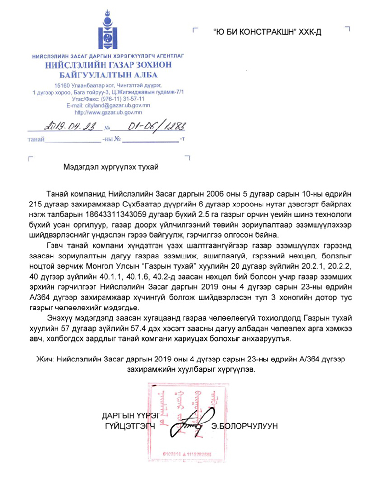 Сүхбаатарын талбайн урд хэсгийн 2.5 га газрыг Нийслэлийн Засаг даргын 2019 оны дөрөвдүгээр сарын 23-ны өдрийн А/364 дүгээр захирамжаар 2.5 га газрыг хувийн аж ахуйн нэгжид эзэмшүүлсэн шийдвэрийг цуцалсан билээ. Дээрх захирамжийн дагуу “Ю Би Констракшн” ХХК-ны нэр дээрх 2.5 га газрын эрхийг хүчингүй болгож, өчигдөр Газар зохион байгуулалтын албанаас тус компанид газар чөлөөлөх тухай мэдэгдэх хуудсыг хүргүүлжээ.