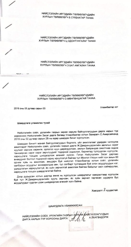 Тэгвэл өнөөдөр тус түр хорооноос Ж.Дамдинцэрэнд хариуцлага тооцуулах тухай Хотын даргад хүргүүлсэн шаардлагаа хэлэлцэн шийдвэрлүүлэхээр НИТХ-ын Дарга, Тэргүүлэгчид, Төлөөлөгчдөд ханджээ.