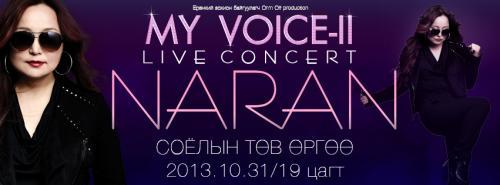 Монголын рок попын тайзыг өөрийн дуу хоолойгоороо хөглөдөг дуучин бол поп дива С.Наран. Тэрээр дөрвөн жилийн өмнө “MY VOICE” хэмээх анхны бие даасан тоглолтоо хийж байсан билээ. Байнга өмд,цамц, нүдний шилээр гангардаг байсан тэрээр энэхүү тоглолтон дээрээ өөртөө зохиосон даашинз өмсөн гарч ирсэн нь үзэгчдэд гэнэтийн бэлэг болж байсан удаатай. Тэгвэл поп дива дуучин бүсгүй энэ сарын 31-нд Соёлын төв өргөөнд 19:00 цагаас ганцхан удаа өөрийн дуу хоолойны үргэлжлэл болгон “MY VOICE-II” бие даасан тоглолтоо хийхээр болжээ.