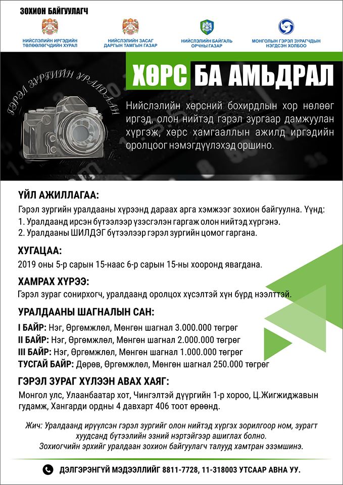 Хөрсний доройтол, бохирдлын асуудалд олон нийтийн анхаарлыг хандуулах түүнээс үүдэн гарах эрүүл мэнд, байгаль орчны тулгамдсан асуудлуудыг шийдвэрлэхэд иргэдийн оролцоог нэмэгдүүлэх зорилгоор “Хөрсний бохирдлыг бууруулах шийдэл” төсөл, бүтээлийн уралдаан, “Хөрс ба амьдрал” гэрэл зургийн уралдааныг 2019 оны 5 дугаар сарын 15-наас 6 дугаар сарын 15-ны хооронд зарлаж байна. Уралдаанд шалгарсан бүтээлүүд нь Нийслэлийн хөрсний бохирдлыг бууруулах шийдэлд хувь нэмрээ оруулах юм.