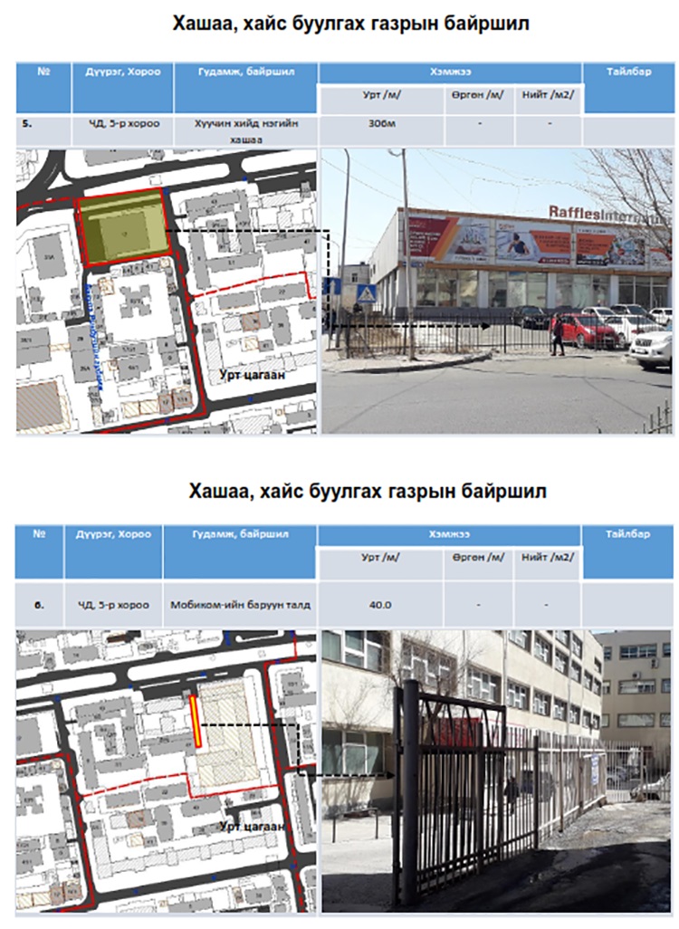 Мөн Улаанбаатар хотын Бага тойрууд байрлах Сүхбаатар дүүргийн 6, 8 дугаар хороо, Чингэлтэй дүүргийн 1, 4 дүгээр хорооны нутаг дэвсгэрт байрлах буулгах шаардлагатай 43 иргэн, аж ахуй нэгж, байгууллагын хашаа, хайс, хаалт, түр хашааны судалгааг гаргажээ. Нийслэлийн нутаг дэвсгэрт дээрх журам хэрэгжиж эхэлсэнтэй холбогдуулан хашаа, хайс барих хүсэлтийн маягт, хашаа, хайсны даалгавар, Хашаа, хайс, түр хашаа, амьд хайсны тохижилтын загвар зургийг боловсруулж батлуулах ажил хийгдэж байна. Тус ажлын хүрээнд нэгдсэн үйлчилгээний төвүүдээр дамжуулан иргэн, хуулийн этгээдийн хашаа, хайс барих хүсэлтийг хүлээн авч шийдвэрлэнэ.