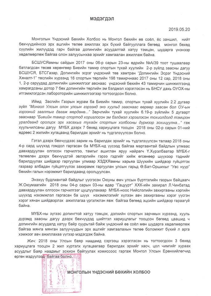 Сэргээш хэрэглэсэн нь шинжилгээгээр тогтоогдсоны улмаас заал, танхимын болон үндэсний баяр наадамд барилдах эрхээ хоёр жилийн хугацаатай хасуулсан, улсын гарьд Ө.Бат-Орших нутгийнхаа дэвжээний нэрэмжит барилдаанд зодоглосон юм. Тэгвэл эл асуудлаар Б.Бат-Эрдэнэ аваргын удирдаж буй Монголын үндэсний бөхийн холбооноос өчигдөр/2019.05.20/ мэдэгдэл гаргаж, гарьд Ө.Бат-Оршихын барилдах эрхийг сэргээгээгүй гэлээ.