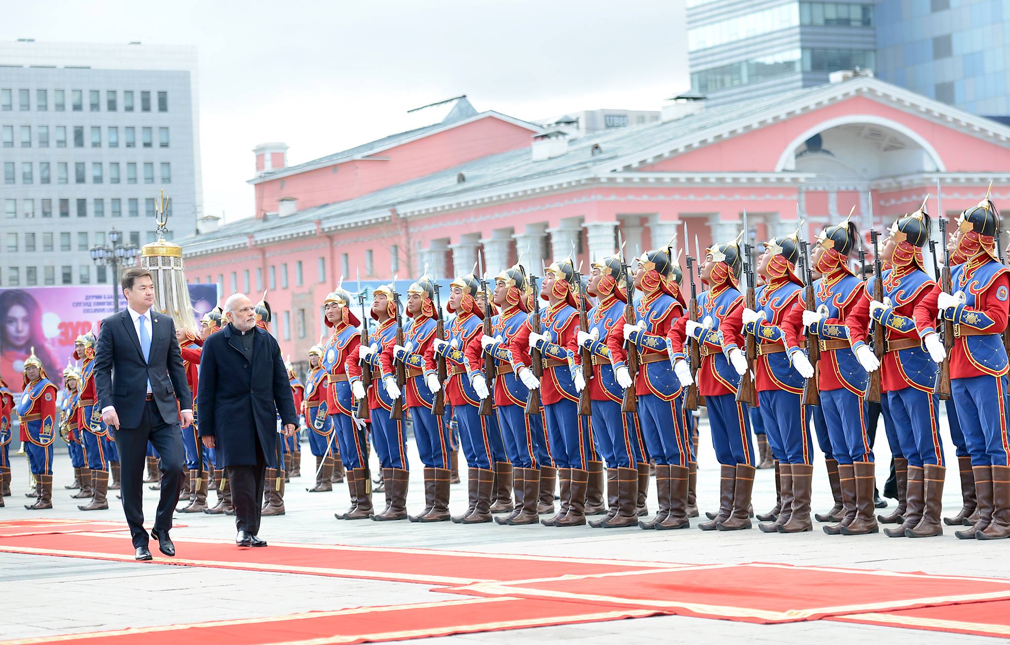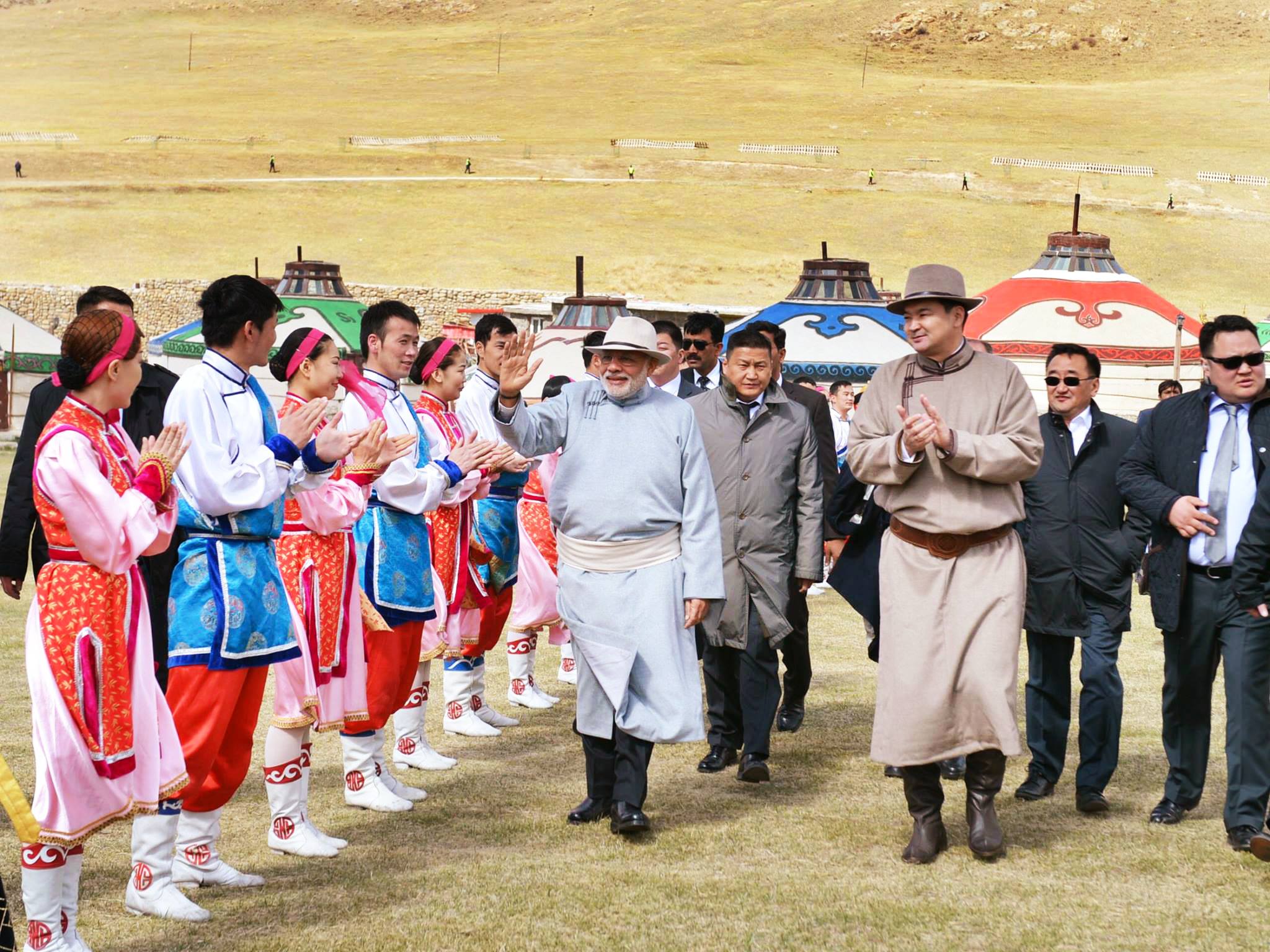Тэрбээр малгай, саарал нөмрөг өмсөж, улбар өнгийн бүс бүсэлсэн байсан талаар “Indian TV News”-т мэдээлсэн байна. Нарендра Модиг 2015 оны тавдугаар сард Монгол Улсад айлчлахад тухайн үеийн Ерөнхий сайд Ч.Сайханбилэг саарал дээл бэлэглэж байжээ.