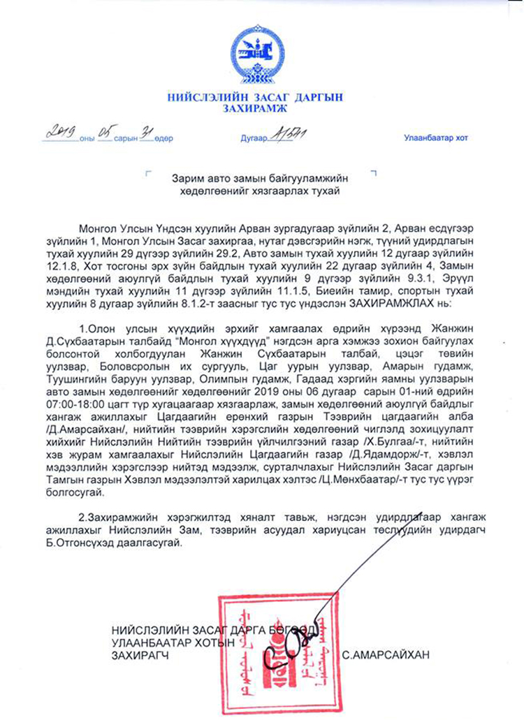 Олон улсын хүүхдийн эрхийг хамгаалах өдөр буюу өнөөдөр /2019.06.01/ Улаанбаатар хотын төв хэсгийн авто замын хөдөлгөөнийг зарим хэсгийг түр хязгаарлах Нийслэлийн Засаг даргын захирамж өчигдөр гарсан. Захирамжид дурдсанаар Д.Сүхбаатарын талбайд “Монгол хүүхдүүд” нэгдсэн арга хэмжээ зохион байгуулах болсонтой холбогдуулж, Д.Сүхбаатарын талбай, Цэцэг төвийн уулзвар, Боловсролын их сургууль, Цаг уурын уулзвар, Амарын гудамж, Туушингийн баруун уулзвар, Олимпийн гудамж, Гадаад хэргийн яамны уулзварын авто замын хөдөлгөөнийг зургадугаар сарын 1-ний өдрийн 07.00 цагаас 18.00 цаг хүртэл түр хязгаарлахаар шийдвэрлэсэн байна.