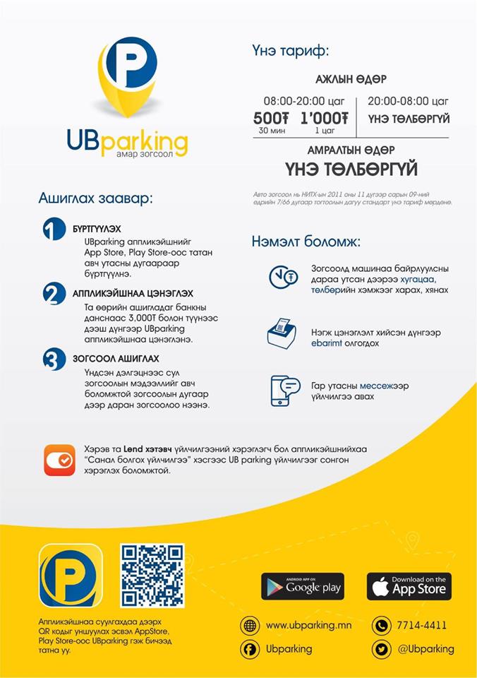 Нийслэлийн засаг даргын 2018 оны А/776 тоот захирамжийн дагуу “УБ Паркинг -Ухаалаг авто зогсоол” төсөл хэрэгжиж эхэлсэн юм. Энэ төслийн хүрээнд Улаанбаатар хотын анхны ухаалаг авто зогсоолын үйлчилгээг энэ сарын 8-нд нээхээр болжээ.