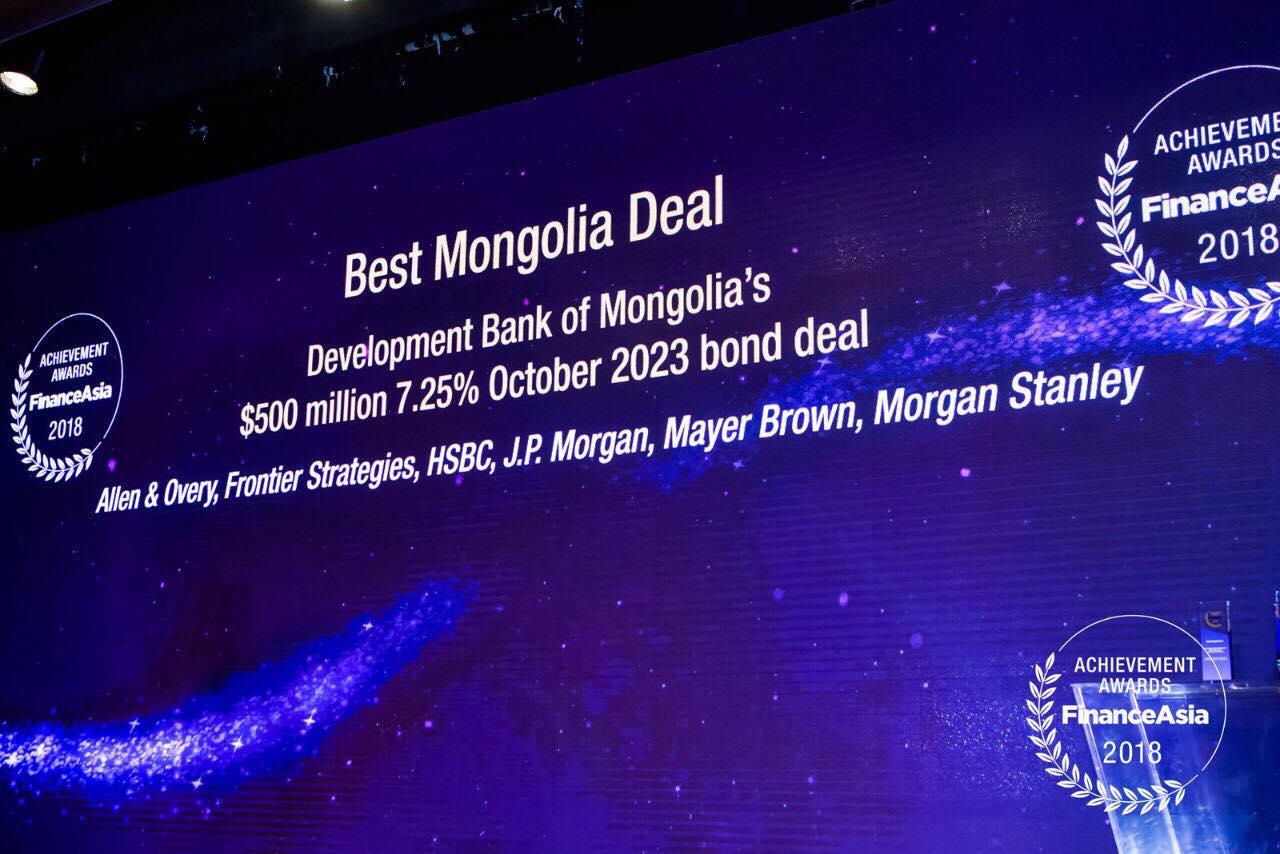 2018 онд Монгол Улсын Хөгжлийн Банк Засгийн газрын баталгаагүй бондыг анх удаа олон улсын зах зээлд амжилттай арилжаалсан нь Монголдоо төдийгүй Азид анхдагч болж “Шилдэг Хэлцэл”-ээр шалгарлааАзийн Санхүүгийн хамгийн нэр хүндтэй сэтгүүл болох “Finance Asia”-ийн 2018 оны шилдэг хөрөнгө оруулалтыг шалгаруулах ёслол энэ сарын 13-нд Хонг-Конг-д зохион байгуулагдлаа.
