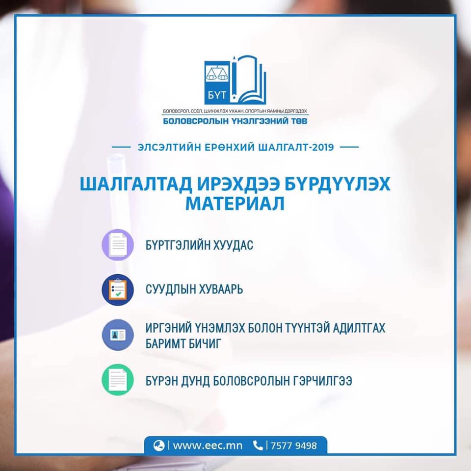 Элсэлтийн ерөнхий шалгалт-2019 шалгалтад ирэхдээ бүрдүүлэх материал: