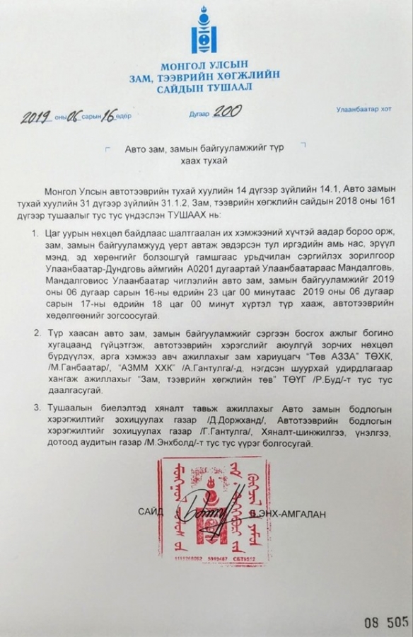 Их хэмжээний хүчтэй аадар бороо орж, зам, замын байгууламжууд үерт автаж, эвдэрсэн тул Улаанбаатар-Дундговь чиглэлийн А0201 дугаартай Улаанбаатараас Мандалговь, Мандалговиос Улаанбаатар чиглэлийн авто зам, замын байгууламжийг 2019 оны зургадугаар сарын 17-ны ѳдрийн 18:00 цаг хүртэл түр хааж, автотээврийн хѳдѳлгѳѳнийг зогсоожээ.