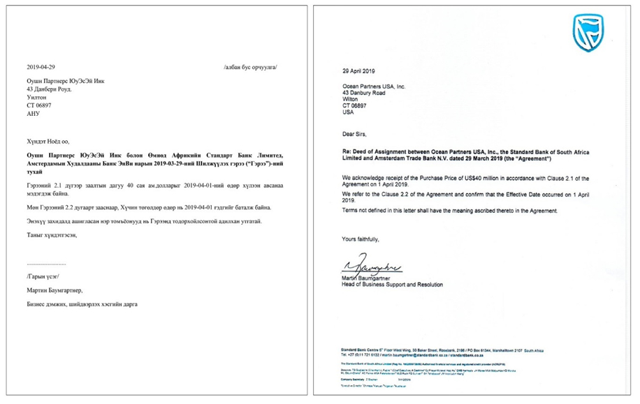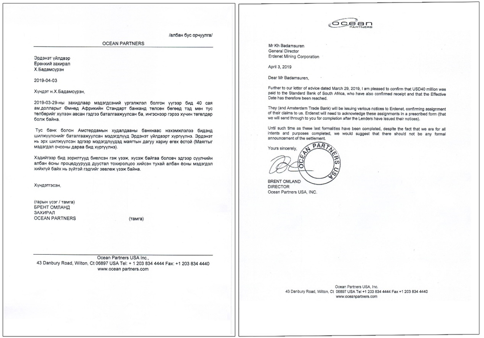 “Эрдэнэт үйлдвэр” ТӨҮГ-аас Өмнөд Африкийн Стандарт банкинд төлөх 40 сая ам.долларыг 2019 оны 03 дугаар сарын 26-ны өдөр шилжүүлсэн. Стандарт банкны зүгээс 2019 оны 04 дүгээр сарын 01-ний өдөр 40 сая ам.доллар хүлээж авсанаа мэдэгдсэн. Энэхүү өр төлбөртэй холбоотой ор үндэслэлгүй мэдээ, мэдээллийг нийгмийн сүлжээгээр нийтлэж байгаа учраас бид албан ёсны эх сурвалжийн хувьд 40 сая ам долларыг Стандарт банк хүлээн авсан тухай  баримтын  хуулбарыг англи, монгол хэлээр хүргэж байна.
