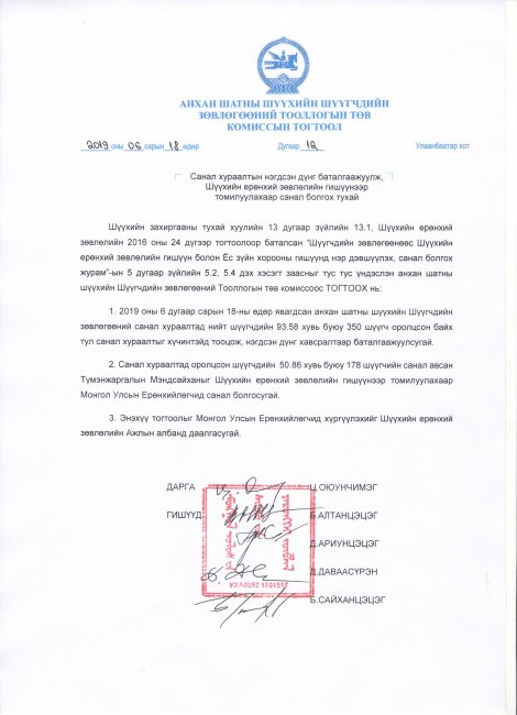 Тиймээс Шүүхийн ерөнхий зөвлөлийн гишүүнээр Түмэнжаргалын Мэндсайханыг томилуулахаар Монгол Улсын Ерөнхийлөгчид санал болгох Анхан шатны шүүхийн шүүгчдийн зөвлөгөөний Тооллогын төв комиссын тогтоол гарлаа.