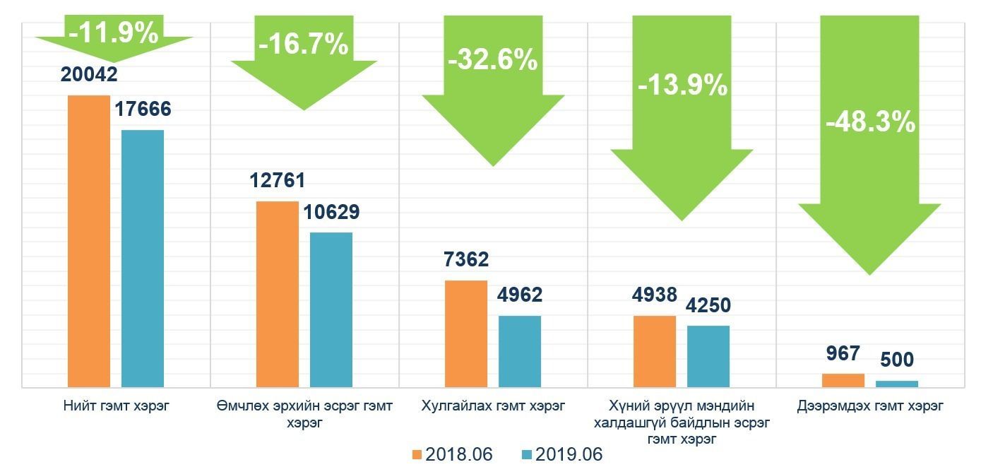 - Хүний эрүүл мэндийн халдашгүй байдлын эсрэг гэмт хэрэг 4,250 бүртгэгдсэн бөгөөд өмнөх оны мөн үеийнхээс Өмчлөх эрхийн эсрэг гэмт хэрэг 16.7 хувиар, Хүний эрүүл мэндийн халдашгүй байдлын эсрэг гэмт хэрэг 13.9 хувиар тус тус буурчээ.