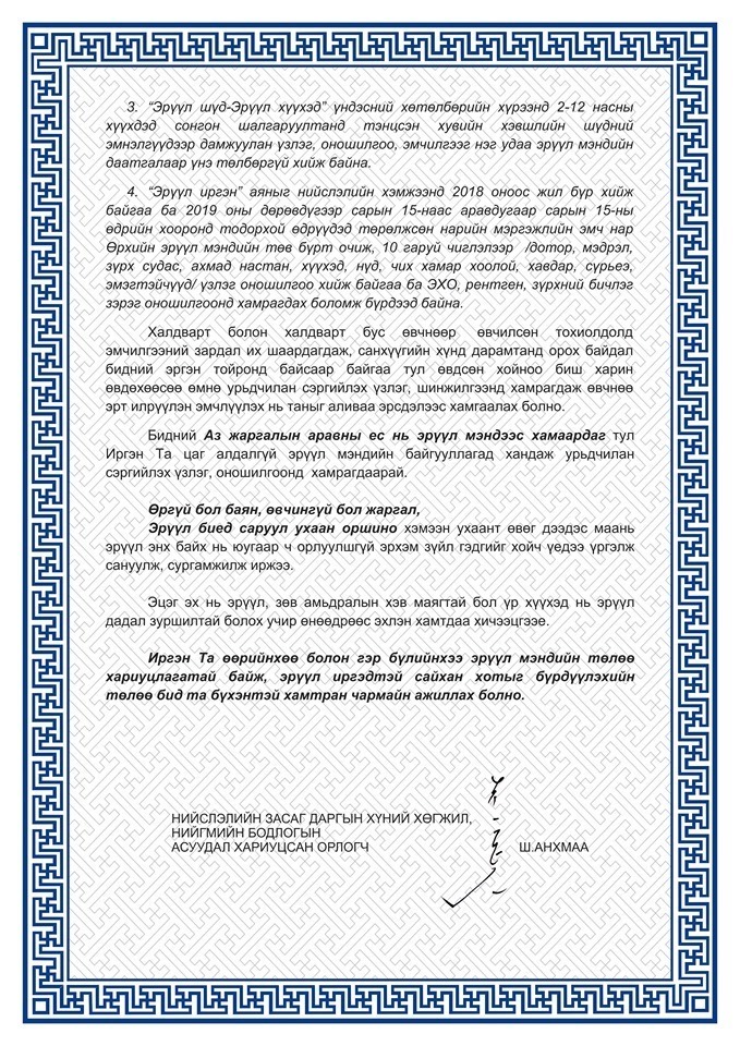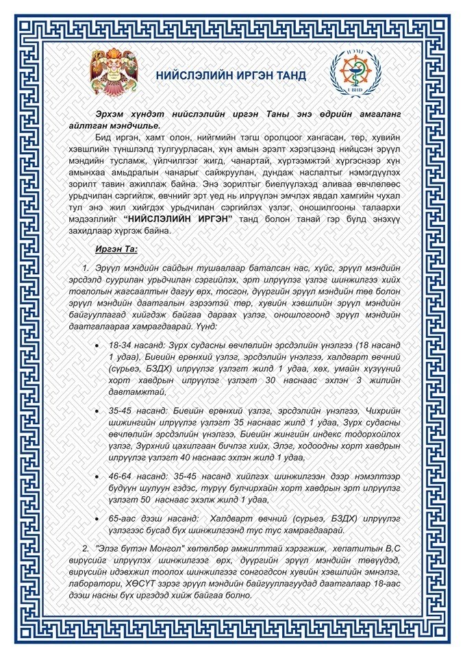 Нийслэлийн Засаг даргын Хүний хөгжил, нийгмийн бодлогын асуудал хариуцсан орлогч Ш.Анхмаа энэ жил хийгдэх урьдчилан сэргийлэх үзлэг, оношилгооны талаарх мэдээллийг ИЛ ЗАХИДАЛ-аар дамжуулан нийслэл хотынхоо нийт иргэдэд хүргэж байна.