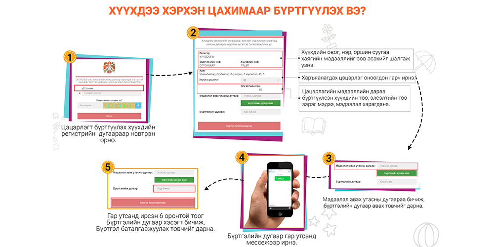 Харин Цахим системд бүртгүүлэх боломжгүй иргэд 2018 оны 07 дугаар сарын 22-ны өдрөөс зөвхөн ажлын өдрүүдэд тухайн дүүргийн Боловсролын хэлтэст, 2019 оны 08 дугаар сарын 12-ны өдрөөс хамран сургах тойргийн цэцэрлэгт өөрийн биеэр очиж бүртгүүлэх боломжтой юм.