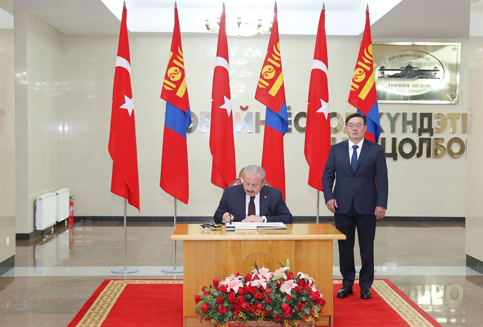 Монгол Улсын Их Хурлын дарга Г.Занданшатар эрхэм зочны хамт Их эзэн Чингис хааны хөшөөнд хүндэтгэл үзүүлсний дараа Төрийн ордны Ёслол хүндэтгэлийн өргөөний Баганат танхимд саатан Бүгд Найрамдах Турк Улсын Үндэсний Их Хурлын дарга Мустафа Шентоп хүндэт зочны дэвтэрт сэтгэгдлээ үлдээн, гарын үсэг зурав.