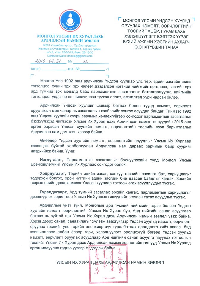 Ардчилсан намын зөвлөл өнөөдөр /2019.07.31/ мэдээлэл хийлээ.Үндсэн хуулийн нэмэлт, өөрчлөлтийг Улсын Их Хурал бус, Ард нийтийн санал асуулгаар батлах нь зүйтэй гэж үзэж байгаагаа илэрхийлж, Монгол улсын үндсэн хуульд оруулах нэмэлт өөрчлөлтийн төслийг хоёр, гурав дахь хэлэлцүүлэгт бэлтгэх үүрэг бүхий ажлын хэсгийн ахлагч Ө.Энхтүвшинд мэдэгдэл хүргүүлж байгаа юм байна.  Ардчилсан намын зөвлөлийн дарга Д.Эрдэнэбат  ” Ардчилсан намын зүгээс Үндсэн хуульд нэмэлт, өөрчлөлт нь аливаа нэг улс төрийн намууд болон гишүүний явцуу эрх ашгийг гүйцэлдүүлэх ёсгүй юм. Өөрчлөлтийн хүрээнд парламентын тогтолцоог сайжруулах, сонгодог, хариуцлагатай парламентыг бий болгоход Ардчилсан тэргүүнд байх ёстой. Энэ Үндсэн хуулийн өөрчлөлт Монгол Улсын ирээдүйг харж, суурь зарчмаа анхаарах ёстой гэж үзсэн. Тиймээс парламентын засаглалын хуваарилалт хангагдаагүй, төрийн эдийн засаг, санхүүгийн байдал доголдолтой, төрийн хариуцлагажуулах тухай асуудлуудыг тусгах шаардлагатай гэж үзсэн байна. Энэ Үндсэн хуулийн нэмэлт, өөрчлөлт өнөөгийн УИХ-аар биш ард нийтийн санал асуулгаар баталгаажих ёстой гэсэн зарчмын байр суурин дээрээ хэвээр байгаа” гэв.