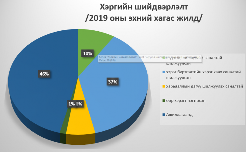 Авлигатай тэмцэх газар 2019 оны эхний хагас жилд хуульд заасан харьяаллын 984 үйлдэлтэй, 283 холбогдогчтой, 834 хэрэгт хэрэг бүртгэлт, мөрдөн байцаалтын ажиллагаа явуулснаас 78 буюу 9.4 хувийг шүүхэд шилжүүлэх саналтай, 308 буюу 36.9 хувийг хэрэг бүртгэлтийн хэрэг хаах саналтай, 51 буюу 6.1 хувийг харьяаллын дагуу шилжүүлэх саналтай прокурорт шилжүүлж, 11 хэргийг нэгтгэн шалгаж, 2 хэргийг түдгэлзүүлж, одоо 384 эрүүгийн хэргийн үлдэгдэлтэй байгаагаас хэрэг бүртгэлтийн 335 хэрэг, мөрдөн байцаалтын 49 хэрэг байна. Мөрдөн шалгах ажиллагаа явуулсан хэргийн шийдвэрлэлт 53.7 хувьтай байна.