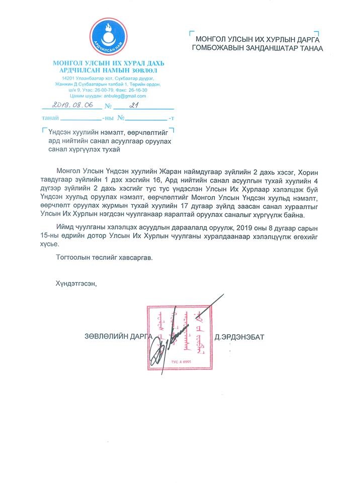 Улсын их хурал дахь Ардчилсан намын зөвлөлөөс өнөөдөр /2019.08.06/ УИХ-ын даргад хүсэлт хүргүүллээ. Хүсэлтэд Үндсэн хуульд нэмэлт, өөрчлөлт оруулахдаа ард нийтийн санал асуулгыг явуулах асуудлыг чуулганы хуралдаанаар яаралтай хэлэлцүүлэхийг хүссэн байна.