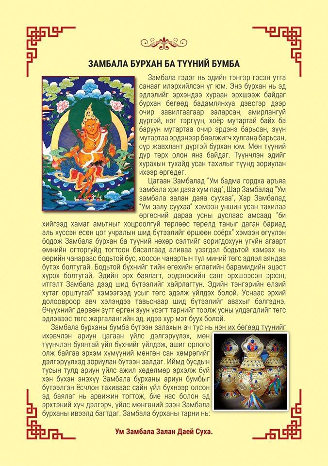• Замбала бурхны бумба гэж бий. Энэ бурхан нь эрхэм хүмүүний ариун явдал, зам үйлээр хурсан эд баялаг,сан хөмрөгийг арвижуулах бүхий шүтээн. Гол төлөв олны сайн сайхны тусын тулд бие, сэтгэлээ зориулж ариун цагаан ажил хөдөлмөр, эрхэлж буй эрхэм хүн бүрийн ашиг орлого, сан хөмрөгийг хурайлан дэлгэрүүлж гарлагагүй байх, үгүйрэл хоосролын гэмийг хаах үүднээс энэ бурхны бумбыг бүтээн залж тахидаг ёстой.